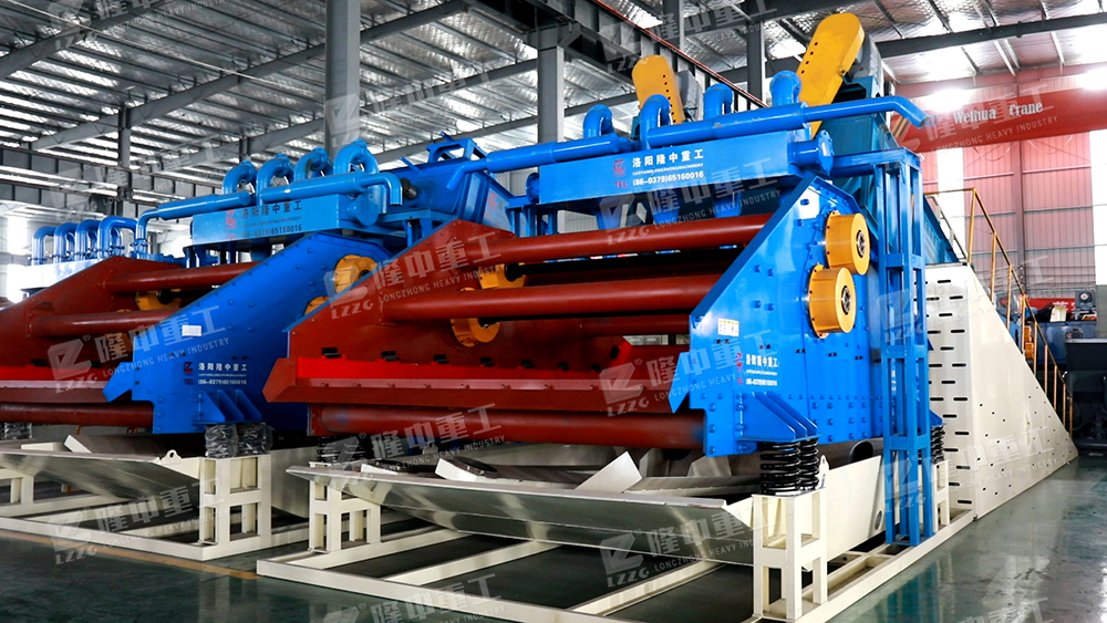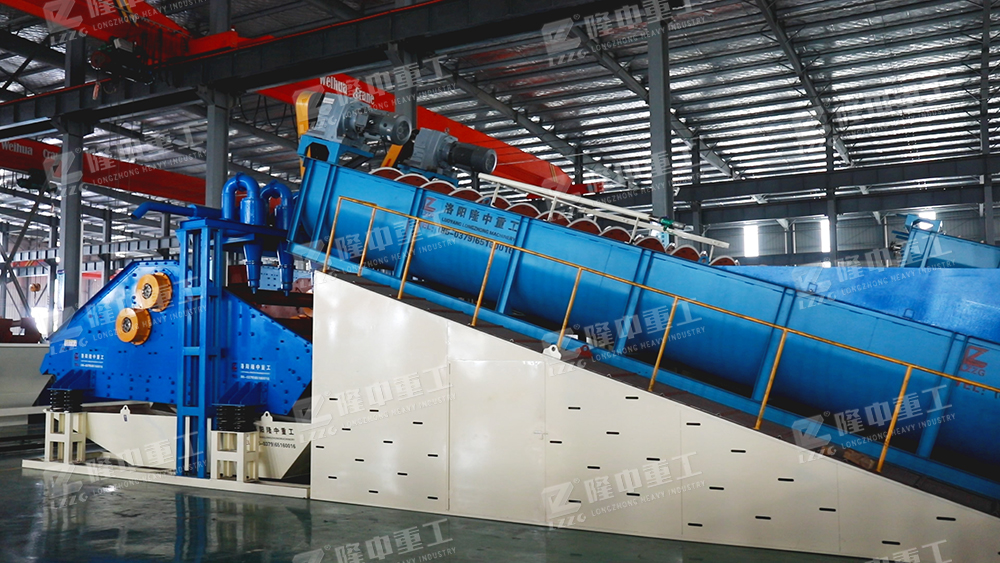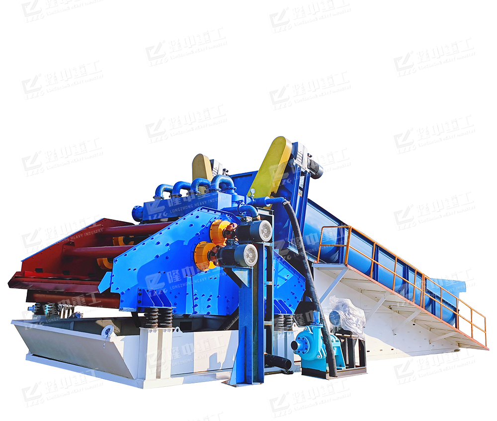 經過破碎篩分后的物料進入螺旋洗砂裝置,清洗之后合格物料將進入后端尾礦干排裝置進行脫水,由于固體物粒大小的不同,比重不同,所以液體中的沉降速度不同,細顆粒浮游在水中成溢流出,粗顆粒沉于槽底,由螺旋洗砂一體機的螺旋推向上部排出,同時利用水力和機械力使礦石碎散并擦洗礦石上的雜質和泥土,洗下礦石表面細泥并分離。旋流器的沉沙嘴位于尾礦干排篩的上方,形成濃縮后的物料落入尾礦干排篩,而旋流器分離的水體流入到回收水箱內部。其余廢水進入反水裝置排出,完成整個流程。
